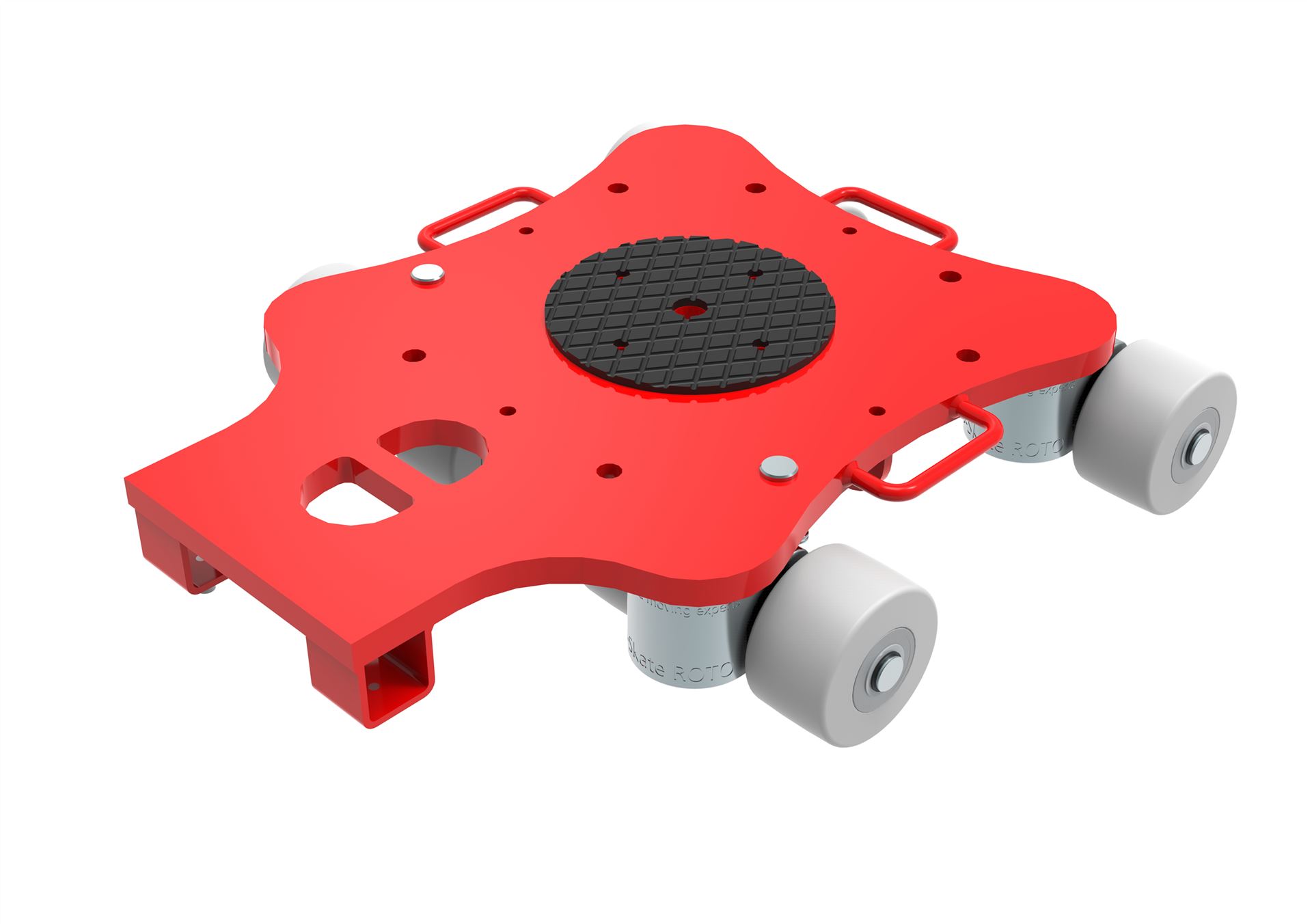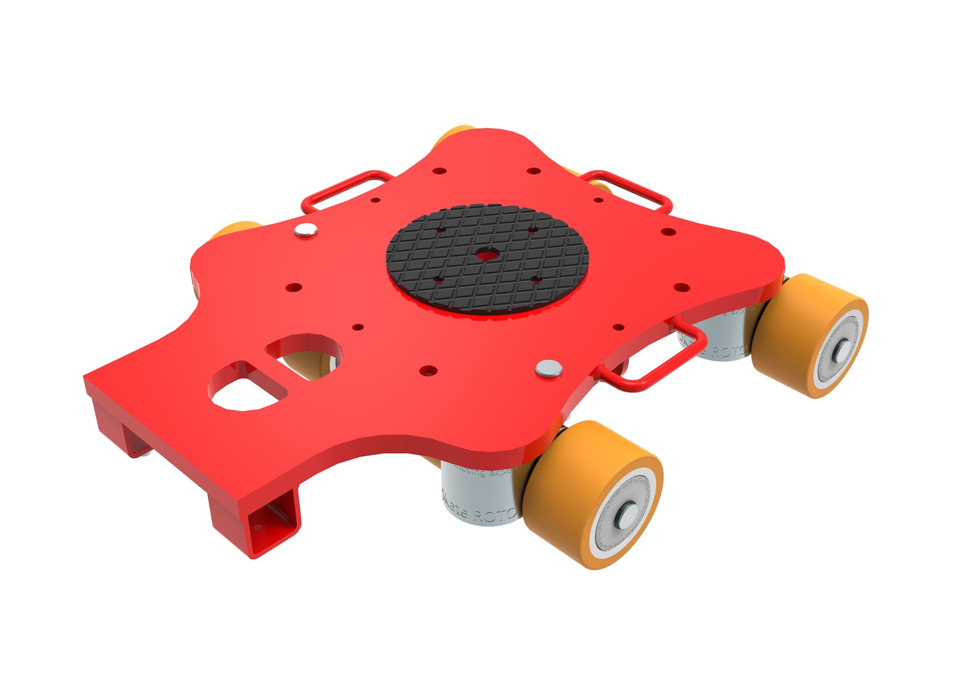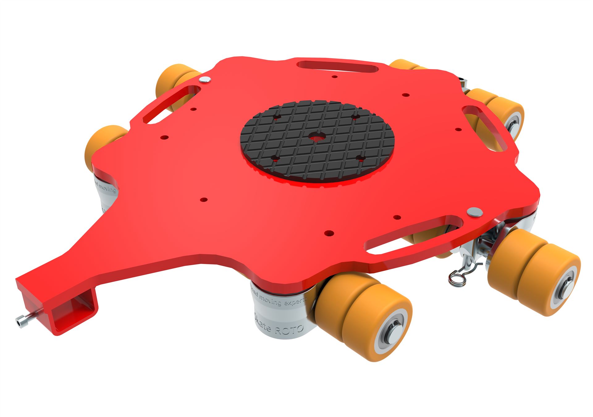 Schwerlasttransportfahrwerk (360°) für den professionellen innerbetrieblichen Schwerguttransport auf sauberen und ebenen Böden. Ausführung mit einzeln drehbaren hochwertigen Polyurethanrollen bzw. Nylonrollen (abriebfest und nicht markierend, für alle glatten Böden geeignet), rutschfestem Waffelgummibelag und Aufnahme für Verbindungsstangen oder Deichsel in verschiedene Varianten. Multifunktional und flexibel durch Fixierung der Radaufnahme mittels Steckbolzen. Dadurch wie ein starres Fahrwerk verwendbar, mit zusätzlichem Drehteller ausgerüstet wie ein lenkbares Fahrwerk verwendbar.